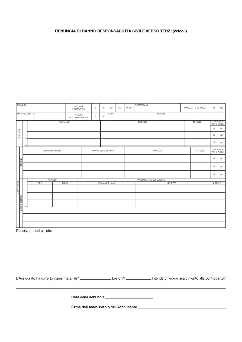La cosa più semplice che devi fare è compilare il modulo blu di constatazione amichevole (C.A.I.), che l’impresa ti ha fornito al momento della sottoscrizione della polizza e inviarlo alla tua impresa. In caso di accordo sulla dinamica del sinistro è importante che il modulo blu venga firmato da entrambi i conducenti coinvolti, per abbreviare le tempistiche del risarcimento dei danni; in caso di disaccordo è comunque utile compilare il modulo singolarmente per fornire la propria versione della dinamica del sinistro.